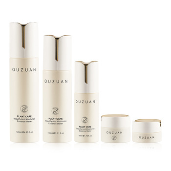 Juego de Botellas de Vidrio Cosméticas Redondas y Rectas de Lujo, Tapa Blanca con Ranura Dorada en el Centro, Beige Mate, Botella con Bomba de 50 ml